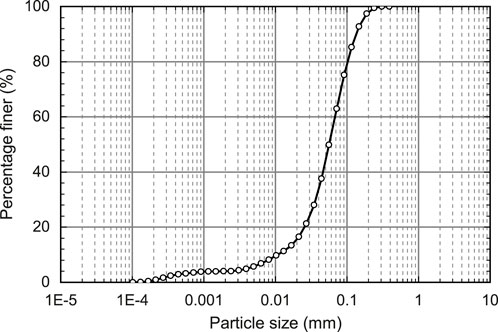 The Malan loess samples employed in this study were obtained from a loess slope located in Mizhi County, Yulin City, Shaanxi Province. During sampling, each loess sample bag was sealed with plastic wrap to minimize moisture loss. Throughout the experiments, the temperature in the centrifuge room was maintained consistent with the field sampling temperature using air conditioning. To thoroughly characterize the material properties, an extensive suite of laboratory tests was performed to evaluate both the physical and mechanical characteristics of the loess. The experimental program included determinations of: natural moisture content, bulk density, specific gravity, maximum dry density, grain size distribution (as shown in Figure 2), Atterberg limits (comprising liquid limit and plastic limit), plasticity index, liquidity index, hydraulic conductivity, compression modulus, and shear strength parameters. Additionally, the soil-water characteristic curve (SWCC) of the loess was established through the transient water release and imbibition method, with the results presented in Figure 3. A comprehensive summary of the fundamental physical and mechanical properties of the investigated loess is provided in Table 1.
