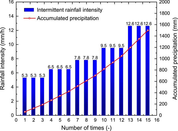 In the current study, the mechanical response characteristics of loess slopes, and the deformation-failure evolution process were systematically investigated by carrying out the centrifuge modeling test of loess slopes under the action of heavy rainfall. The experimental design used intermittent heavy rainfall conditions under different rainfall intensities, with the rainfall intensity increasing from 5.3 mm/h to 12.6 mm/h step by step, and the rainfall cycling three times at each level of rainfall intensity (see Figure 4). The duration of a single rainfall is 14 h, and 86.5-h interval is set at the end of each rainfall. Therefore, a total of 15 rainfall events were applied to the loess slope. The intensity and duration of the rainfall were selected to represent the realistic severe prototype storm event, in compliance with the scaling laws governing centrifuge modeling. This rainfall level was chosen both because it falls within the range of historically recorded extreme rainfall events and because of the constraints imposed by the experimental setup, which has a minimum achievable rainfall intensity of 5.3 mm/h.