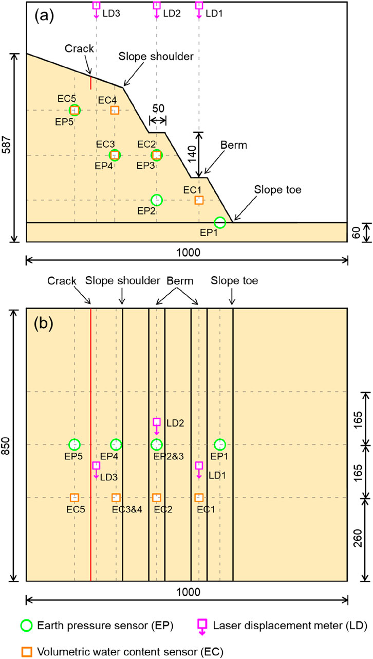 As shown in 5, the modeled slope is designed as a terraced structure with overall dimensions of 1,000 mm (length) × 850 mm (width) × 527 mm (height) and a 60 mm thick foundation soil layer at the bottom. The main body of the slope consists of three secondary slopes, each with a height of 140 mm, a berm width of 50 mm, and a slope angle of 60°. A prefabricated crack was constructed at the top of the slope model, and the crack were 40 mm in depth and 4 mm in width to simulate the characteristics of crack development in natural slopes. By setting the crack condition, it can systematically reveal the influence law of structural features on slope stability. The determination of model size and crack parameters is based on the principle of similarity ratio to ensure that the test results can reflect the mechanical behavior characteristics of the prototype slope. The centrifugal model test was designed based on a geological prototype of a loess cut slope along a highway in Qingjian County, Yulin City, Shaanxi Province. A scaled indoor model was constructed using data obtained from field surveys and UAV aerial mapping. The prototype slope features a three-tiered stepped structure, with a total height of approximately 18 m (each tier being 5–7 m high) and berm measuring 2–3 m in width. Geological field investigations revealed that, under years of intermittent rainfall, erosion features such as gullies and sinkholes progressively developed on the slope. These eventually led to a landslide during rainy season in 2023.