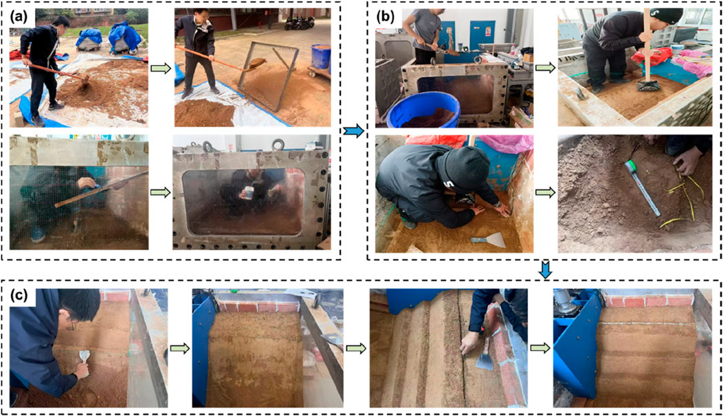 Figure 6. Construction process of the terraced loess slope model: (a) Preparation of soil and model box, (b) Filling soil and sensor arrangement, and (c) Slope excavation and crack construction.