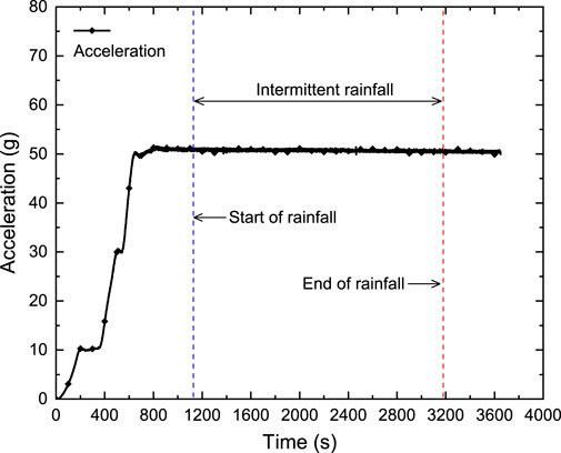 Before applying rainfall, according to the rainfall conditions designed for the test, set the collection interval (1s) and the corresponding rainfall intensity and duration of the data acquisition instrument through the control software. After the parameters were configured, the centrifuge was started, loaded step by step to the target acceleration of 50 g, and operated stably for 5 min, so that the internal stresses of the slope model reached the equilibrium state. Subsequently, the rainfall equipment was activated to apply simulated rainfall lasting 20.2 s to the slope model. After completing the scheduled rainfall, the 50 g centrifugal force was continued for 124.6 s to observe the deformation response of the slope. If the slope did not show any obvious damage, the rainfall was applied cyclically until the overall destabilization damage of the slope occurred. Figure 7 shows the acceleration-time curve of the centrifuge model test.