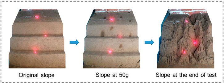 Slope exhibits different states under different external conditions. Figure 8 shows the terraced loess slope at initial state, acceleration of 50 g, and final state after intermittent heavy rainfall. It should be noted that the three red points on the slope surface in the figure are the measurement points of the laser displacement sensors. During the gradual acceleration of the model slope from 0 g to 50 g, the slope primarily undergoes vertical consolidation settlement. This occurs because the increase in acceleration leads to greater soil self-weight and intensified particle movement, resulting in reduced pore space and overall volume compression. The stress concentration occurs at the toe of each sublevel of the slope, especially at the bottommost toe, where the slope surface peels off. Moreover, multiple tension cracks have appeared at the top of the slope and various berms, and the prefabricated cracks at the top of the slope have expanded. After experiencing multiple rainfall events with different rainfall intensities, the slope underwent significant deformation and damage, with severe erosion from slope top to slope toe. Several gullies of varying depths and widths developed, and the loess on the slope was eroded by rainwater and accumulated at the toe of the terraced loess slope.