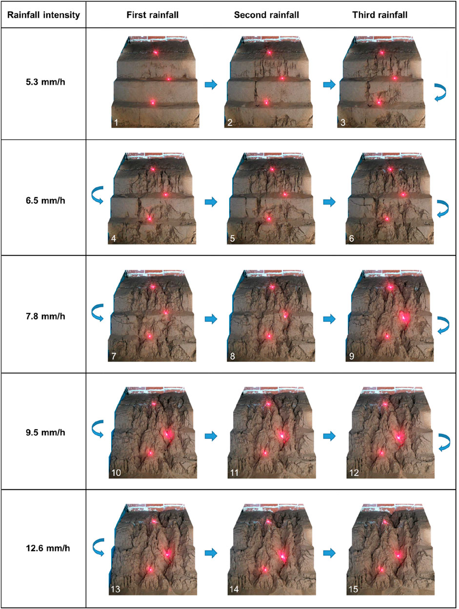 Previous experimental and numerical studies have shown that both rainfall patterns and slope geometry significantly influence the deformation and failure behavior of loess slopes (Sun et al., 2019; Zhang et al., 2019). Rainfall intensity primarily affects the temporal progression of slope deformation and failure, with less impact on the overall failure mode. When the rainfall intensity reached a certain level, the rainwater not only infiltrated into the slope but also flowed along the slope surface (Sun et al., 2021). In the present study, the minimum rainfall intensity is 5.3 mm/h, which is relatively large, thus the scouring failure replace the damage pattern of landslides and become the main failure pattern of slopes. Under these conditions, scouring failure tends to replace landslides as the dominant failure pattern, a finding consistent with Zhen et al. (2023). Furthermore, the failure mode differs between continuous and intermittent heavy rainfall. Under intermittent rainfall, erosion often occurs at the slope shoulder, while collapse is observed at the toe. After multiple rainfall events, tension cracks frequently develop at the trailing edge of the slope.