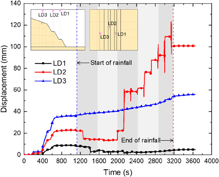 Figure 10 shows the time-dependent deformation curves of the slope surface measured by three laser displacement sensors. The detailed positions of the three laser displacement sensors are shown in Figure 5. It should be noted that the five shaded stripes in Figure 10 correspond to rainfall processes of five different intensities. Each stripe includes three rainfall events and three intermittent periods, but the last stripe includes three rainfall events and two intermittent periods. According to the deformation of the slope surface, the deformation and failure of the terraced loess slope can be divided into three stages: loading-consolidation stage, rainfall erosion-deformation stage, and post-rainfall stability stage. During the loading-consolidation stage, the displacement at different points shows a regular variation with the change of acceleration. The displacement of the slope increases with the increase of acceleration, and when the acceleration reaches the predetermined value (50 g), the deformation of the slope first slightly increases and then tends to stabilize. During the rainfall erosion-deformation stage, the trend of slope deformation measured by the three displacement sensors is significantly affected by the rainfall process. During the entire rainfall process, the slope displacement (LD3) near the crack on the top of the slope increases continuously with the increase of intermittent rainfall intensity and frequency, that is, the soil at the top of the slope is continuously eroded by rainfall. The slope displacement (LD2) at the second sublevel berm first decreases and then increases in fluctuation, that is, the eroded soil on the third sublevel slope and slope top first accumulates at this berm, and then with the increase of rainfall intensity, the soil on this berm is continuously eroded. The slope displacement (LD1) at the first sublevel berm first decreases and then slightly increases with the rainfall process, that is, the berm is first accumulated with soil particles and then eroded. Among the three displacement monitoring points, LD2 has the largest displacement change amplitude, and its abrupt changes all occur during the rainfall event stage. In the early stage of rainfall, the lower part of the slope mainly receives the accumulation of soil after erosion from the upper part. In the later stage of rainfall, the soil in the lower part of the slope begins to be continuously eroded and accumulates towards the toe of the slope, while the soil at the top of the slope is continuously eroded throughout the entire rainfall process. In the stable stage after rainfall, the deformation of the slope at each monitoring point is basically stable, showing a slight increasing trend. This is because the slope soil undergoes creep under the action of rainwater infiltration and loading.