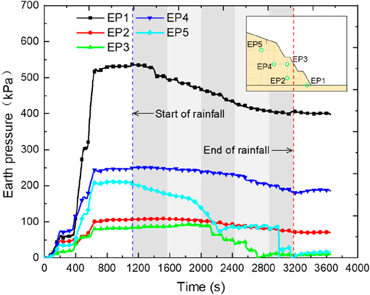Figure 11 shows the variation curve of earth pressure over time measured by the earth pressure gauges embedded inside the slope. The detailed location of the earth pressure gauges is shown in Figure 5. According to the trend of earth pressure changes, the mechanical response process of the slope can also be divided into three stages: loading-stress increase stage, rainfall erosion-stress fluctuation stage, and post-rainfall stress stability stage. In the first stage, the vertical stress inside the slope increases continuously with the increase of acceleration. When the acceleration reaches 50 g, the stress inside the slope first slightly adjusts and then tends to stabilize, reaching a stress equilibrium state. During the intermittent rainfall stage (i.e., the second stage), the earth pressure at different points fluctuates with the rainfall process. EP1 has the highest earth pressure value, which is due to the thick overlying soil layer and obvious stress concentration phenomenon. The earth pressure of EP3 is the smallest, which is due to the thinnest soil layer on top of the earth pressure gauge at that location. In the early stage of rainfall, the earth pressure of EP2 and EP3 first increases and then continuously decreases. The main reason is that rainfall erosion moves the upper soil of the slope to above EP2 and EP3, causing the overlying soil layer to thicken. The reason for the slight increase in earth pressure values of EP1 and EP4 is that the soil in the slope gradually saturates, leading to an increase in soil weight. The earth pressure decrease in EP5 is due to the expansion of cracks caused by rainfall, resulting in the downward sliding of the soil at the top of the slope and a reduction in overlying earth pressure. As the rainfall continues, the earth pressure values at each point decrease, with EP1, EP2, and EP5 showing the greatest reduction. EP1 decreases continuously with the increase of rainfall intensity and frequency, which is related to the continuous erosion and peeling of the soil at the toe of the slope (see Figure 9), leading to stress release. EP2 and EP4 are buried inside the slope, and their sensitivity to changes in the overlying soil is relatively low, resulting in their value changes slight. The earth pressure of EP3 and EP5 significantly decrease in the middle and late stages of rainfall, which is related to the strong erosion caused by rainfall (see Figure 9). In the late stage of rainfall, the values of EP3 and EP5 decrease to almost zero, indicating that the soil at EP3 and EP5 is most severely eroded, and the overlying soil is almost completely eroded. The change in earth pressure reflects the variation law of the internal stress field of the slope, which is closely related to the rainfall process. The erosion stress of the soil decreases, the accumulation stress of the soil increases, and the sudden drop in earth pressure is related to the local collapse of the slope. In the third stage, after the rainfall, the slope soil undergoes internal stress adjustment due to creep, and overall the earth pressure tends to be constant.