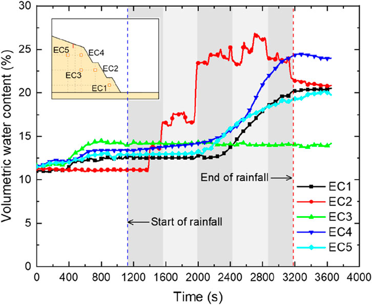 Figure 12 shows the variation curve of volume moisture content over time measured by the moisture content meters embedded inside the slope. The detailed location of the moisture content meters is shown in Figure 5. As shown in the figure, the transport law of water in the slope under rainfall is significantly affected by the loading and rainfall processes. During the loading and consolidation stage of the slope, except for EC2, the moisture content of each monitoring point increases with the increase of acceleration. When the acceleration reaches 50 g and runs stably for a period of time, the soil moisture content gradually tends to stabilize. The moisture content increases with the increase of acceleration, because as the acceleration increases, the self-weight load on the soil increases, and thus the soil is compacted and the pores decrease. In the end, the total volume decreases, resulting in an increase in moisture content. The moisture content measured by EC2 does not change with the acceleration, which may be because EC2 is closest to the slope surface and tensile cracks are generated near the slope surface at the second sublevel berm during the loading process, making it difficult to compact the soil. The moisture content measured by EC3 increases the most during the loading stage, which is related to the burial depth of EC3. The soil in the deep part of the slope is more compressed and consolidated, resulting in a greater reduction in volume. During the rainfall erosion and infiltration stage, the response characteristics of moisture content at different locations vary with the rainfall process. Except for EC3, the soil moisture content at each point first remains constant with rainfall and then rapidly increases. Due to the deep burial depth of EC3, the rainwater infiltration line always does not reach this point during the entire rainfall process, so the measured moisture content at this point remains unchanged. The response time of EC2 is earliest because the sensor is buried under the berm and has a shallow depth. In addition, during the loading process, tension cracks are generated at this location, making it easier for rainwater to collect and infiltrate into the interior of the slope. The special location of EC2 and the presence of internal cracks in the slope make it easy to collect and dissipate rainwater, resulting in the largest change in measured moisture content. The moisture content curve fluctuates throughout the entire rainfall and intermission period. The values of EC1, EC4, and EC5 remain basically unchanged under the first two rainfall intensity conditions, and then as the rainfall intensity and frequency increase, the infiltration line reaches the sensor position, causing a sudden increase in moisture content. Due to the presence of prefabricated cracks at the top of the slope, although EC5 is buried deeper, its measured moisture content suddenly increases slightly earlier than EC4. In the post-rainfall stage, due to the slope always being within a 50 g gravity field, rainwater continues to migrate towards the interior of the slope, resulting in a continuous decrease in the surface soil moisture content (EC2 and EC4) and a slight increase in the deep soil moisture content (EC1 and EC5).