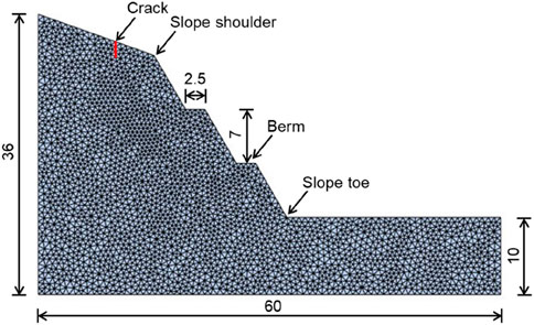 A Y-Mat program was used to establish the numerical model of terraced loess slope. The theoretical basis of the Y-Mat program is the hybrid FDEM proposed by Munjiza et al. (1995), which can effectively solve material deformation and fracture problems. Y-Mat program is based on the original program Y code. Additionally, it has been improved in three aspects, including a simpler and more efficient algorithm to calculate the contact force, an algorithm for tangential contact force closer to the actual physical process, and a plastic yielding criterion (e.g., Mohr-Coulomb) to modify the elastic stress for fitting the mechanical behavior of elastoplastic materials. Then, a program integrating the core algorithm, pre-processing, and post-processing was written on the MATLAB platform to facilitate numerical simulation. More details concerning the Y-Mat program can be found in Liu et al. (2022).