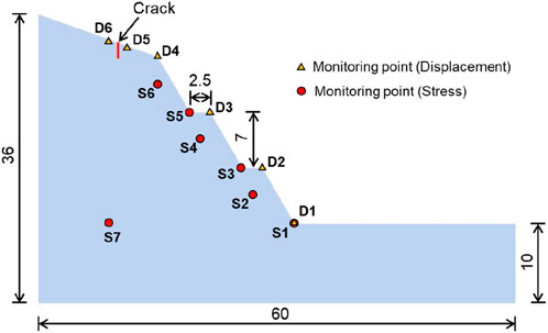 Based on the results of centrifuge model test, a numerical model was established, as shown in Figure 13. The length, the left height, and the right height are 60 m, 36 m, and 10 m, respectively. The boundary condition of this model is to fix the normal displacement of the left and right sides and the bottom. The crack in depth of 2.0 m is constructed using adhesive crack model elements embedded between any two adjacent mesh elements. The numerical calculation parameters were determined based on the results obtained from laboratory experiments and trial calculation. The Y-Mat program was used to first calculate the self-weight balance of the model. Then, rainfall was applied to the model by reducing the mechanical parameters of the loess. It is mentioned that simulating landslide deformation and failure coupled with rainfall infiltration remains a challenging task in numerical modeling. A simplified approach can effectively capture the rainfall infiltration process. Unlike previous methods that uniformly weakened all parameters or those of a specific stratigraphic layer, the current strategy involves dynamically updating parameters to achieve equivalent infiltration depth, i.e., weakening parameters to depths corresponding to the actual infiltration over time. Additionally, infiltration occurs more rapidly in cracked zones compared to intact areas. Finally, the mechanical calculation was performed again to calculate the deformation and failure processes. To monitor the variation in slope surface deformation and the internal stress field, several monitoring points were established, including six displacement points and seven stress points, as shown in Figure 14.