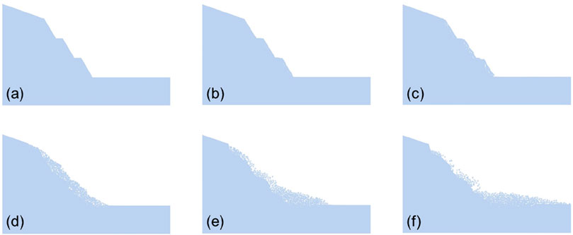 Figure 15 shows the deformation and failure process of the terraced loess slope obtained from the FDEM numerical simulation. The deformation and failure process of the terraced loess slope under rainfall can be mainly divided into three stages: shallow soil spalling, local collapse, and overall collapse. In the early stages of rainfall, the shallow soils experience peeling, and the surface soil becomes loose (see Figures 15b,c). As the rainfall continues, the potential sliding surfaces in sublevels of slope gradually connect, and the soil begins to collapse and accumulate towards the toe of the slope (Figure 15d). Then tension cracks appeared at the top of the slope, and the collapse range increased. The thickness of soil accumulation near the toe of the slope increased and slid further away (see Figure 15e). Finally, the loose soil on the slope slid down to the toe of the slope, causing the overall collapse of the slope, but the collapse boundary at the top of the slope was controlled by the prefabricated crack on the top of the slope (Figure 15f).