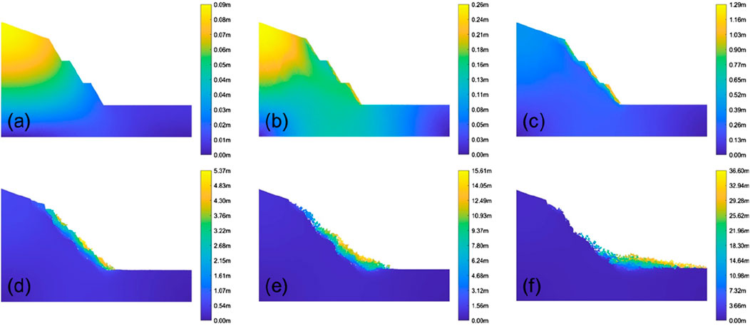 Figure 16. Total displacement contour of the terraced loess slope during rainfall. (a) step 0; (b) step 40000; (c) step 75000; (d) 130000; (e) 215000 and (f) 405000.