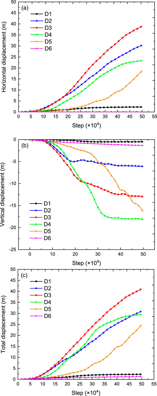 Figure 17 plots the displacement (horizontal, vertical, and total) against the calculation step for all six monitoring points during the rainfall event. It can be observed that the displacement variations at different locations differ significantly, which is closely associated with the slope deformation and failure process. Regarding horizontal displacement, the order of magnitude is D3 > D2 > D4 > D5 > D6 > D1, with the largest displacements observed in the middle part of the slope (D2 and D3). Major deformation occurs mainly at the crest of each sublevel slope (D2, D3, D4), while displacement at the slope toe (D1) remains relatively small. Due to the presence of pre-existing cracks at the slope top, the outer side of the crack experiences substantial deformation, whereas the inner side shows minimal horizontal displacement. Moreover, the deformation rate at D5 lags behind that at D4 because the slope at D4 collapses first, resulting in the loss of lateral support at D5, which in turn accelerates its subsequent deformation. The variation pattern of vertical displacement differs from that of horizontal displacement. The order of vertical displacement magnitude is D4 > D5 > D3 > D2 > D6 > D1, with the maximum value occurring at the crest of the third sublevel slope (D4) and the minimum at the slope toe (D1). Except for D5, the vertical displacement rate at each point initially increases and then decreases, indicating that under rainfall infiltration, the slope undergoes accelerated deformation first before tending to stabilize. Based on the total displacement curves, the greatest deformation is observed in the upper part of the slope. In contrast, deformation at the slope toe and inside the crack is relatively small. The displacement values at the slope top (D6) and the slope toe (D1) are almost equal and represent the least deformed areas throughout the slope.