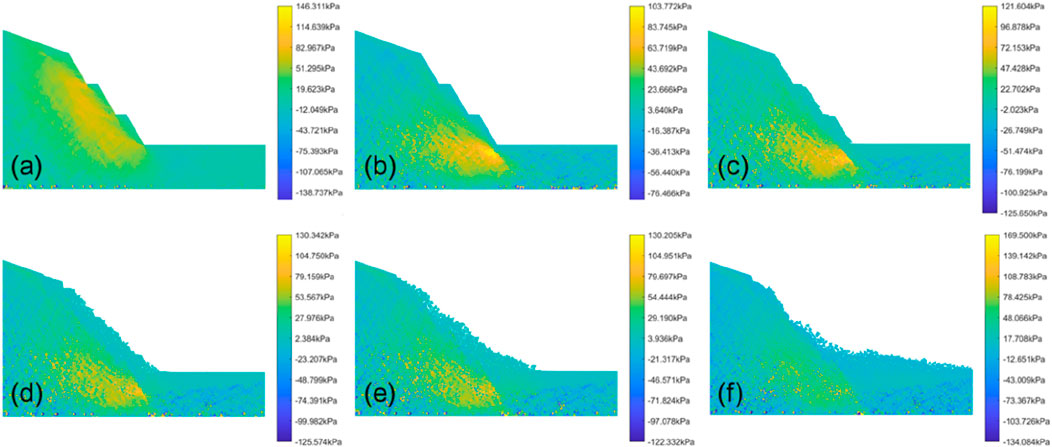 Figure 18. Shear stress contour of the terraced loess slope during rainfall. (a) step 0; (b) step 40000; (c) step 75000; (d) 130000; (e) 215000 and (f) 405000.