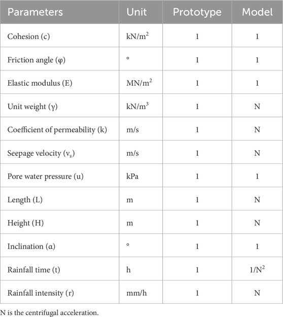 The centrifugal acceleration in the model test is set as N = 50 g, and according to the similarity theory, it is known that the geometric similarity ratio Cl=N=50. Table 2 lists the similarity ratios in the centrifuge model test. From Table 2, it can be seen that each level of the prototype slope is 7 m high, the width of berm is 2.5 m, and the total height of the slope is about 26.35 m. The rainfall intensity in the centrifugal machine is 265–630 mm/h, and the time of each rainfall is 20.2 s. After the rainfall is over, the slope model continues to run for 124.6 s under the condition of 50 g and then rainfall is applied again.