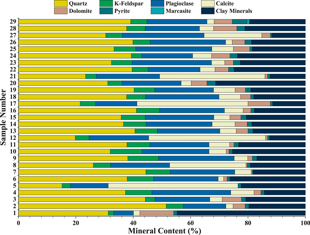 The shale in the research block exhibits a complex and rapidly changing mineral composition, with significant vertical heterogeneity. X-ray diffraction (XRD) analysis of the whole-rock mineral composition (Figure 2) indicates that the shale in the study section is primarily composed of feldspathoid minerals (average content of 64%), followed by clay minerals (21%), with the lowest content of carbonate minerals (15%). The mineral composition shows distinct vertical differentiation, with higher clay mineral content in the upper section (up to 35%), while the lower section contains a significantly higher proportion of brittle minerals (feldspathoid + carbonate minerals), exceeding 80%. This significant variation in mineral composition leads to a complex and diverse distribution of organic matter, posing a severe challenge to accurate TOC prediction.