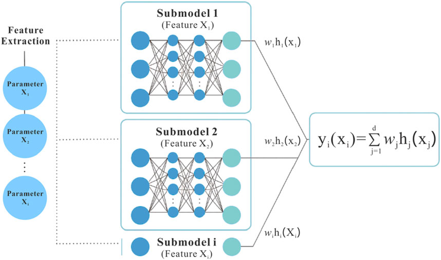The Interpretable Neural Network (INN) uses a structured network architecture design (Figure 3) to decouple the complex input-output mapping relationships into nonlinear mathematical expressions between variables, thereby enabling qualitative analysis of the contribution of individual features (Castillo, 1998; Zhang L et al., 2023). In traditional neural networks, when adjusting the connection weights of the hidden layers, all input data are typically processed together to achieve optimal prediction performance, but the correlations between inputs and outputs based on hidden information cannot be evaluated. In contrast, the INN can visualize the interaction relationships between each input feature and the target variable, thus achieving a transition from a “black-box” to a “white-box” model.