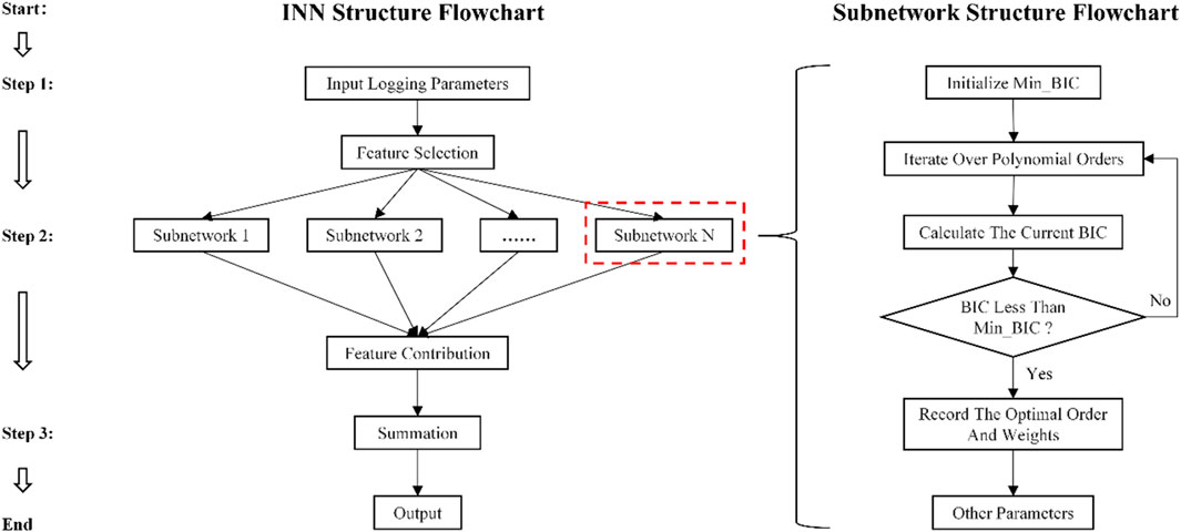 To address these issues in the prediction of shale TOC content, this study proposes an INN-BIC algorithm based on the Bayesian Information Criterion (BIC). The model improves upon the original INN framework by introducing a dynamic polynomial modeling mechanism, i.e., by introducing the BIC criterion to automatically select the optimal polynomial degree for each geological feature, effectively solving the model rigidity problem caused by manually presetting fixed degrees in the original INN. Specifically, the algorithm independently calculates the BIC values for different polynomial degrees for each feature, autonomously selecting the degree and weight corresponding to the minimum BIC to quantify the balance between model complexity and goodness of fit (Equation 4).