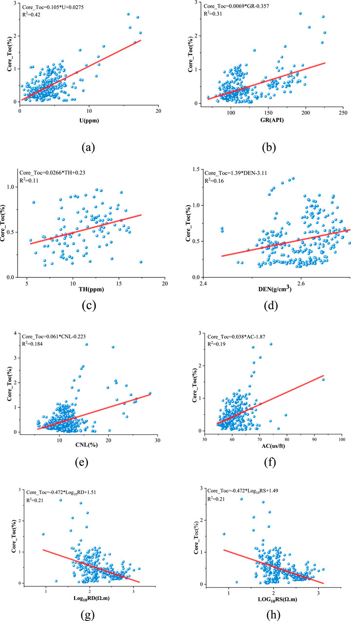 Figure 5. Correlation analysis between logging parameters and TOC. (a) U and TOC. (b) GR and TOC. (c) TH and TOC. (d) DEN and TOC. (e) CNL and TOC. (f) AC and TOC. (g) RD and TOC. (h) RS and TOC.
