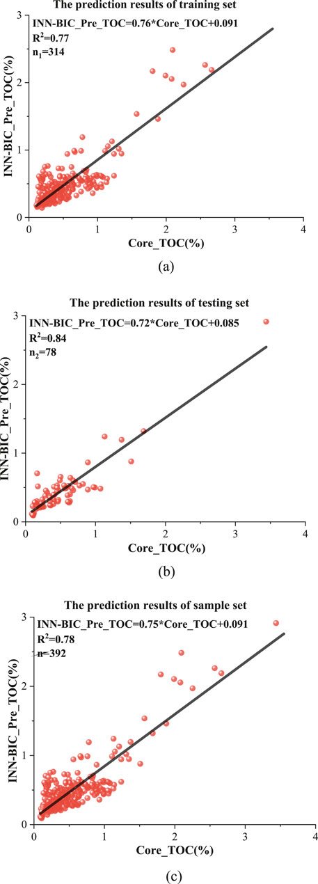 The INN-BIC model’s prediction results are shown in Figure 6. The coefficient of determination (R2) between the predicted and measured TOC values for the training, testing, and total sample sets all exceed 0.89, showing good fitting performance. This result validates the accuracy and reliability of the INN-BIC model in predicting TOC for source rocks, providing reliable technical support for subsequent research.