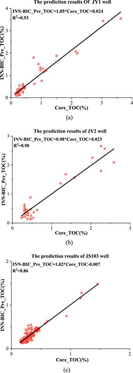 The actual application results for Well JS103, shown in Figure 8, indicate that the INN-BIC model’s predictions are in good agreement with the core experimental results, with accuracy significantly improved over the original INN model. The model effectively overcame the modeling bottleneck of TOC prediction in highly heterogeneous shale reservoirs (e.g., the 3,350 m–3,390 m section). Under small sample conditions, the INN-BIC model exhibited exceptional prediction accuracy and demonstrated efficient offline inversion capability based on analytical formulas, providing a technical tool for shale organic matter abundance evaluation. The research results show that the INN, optimized using the BIC, is applicable for TOC prediction in highly heterogeneous reservoirs.