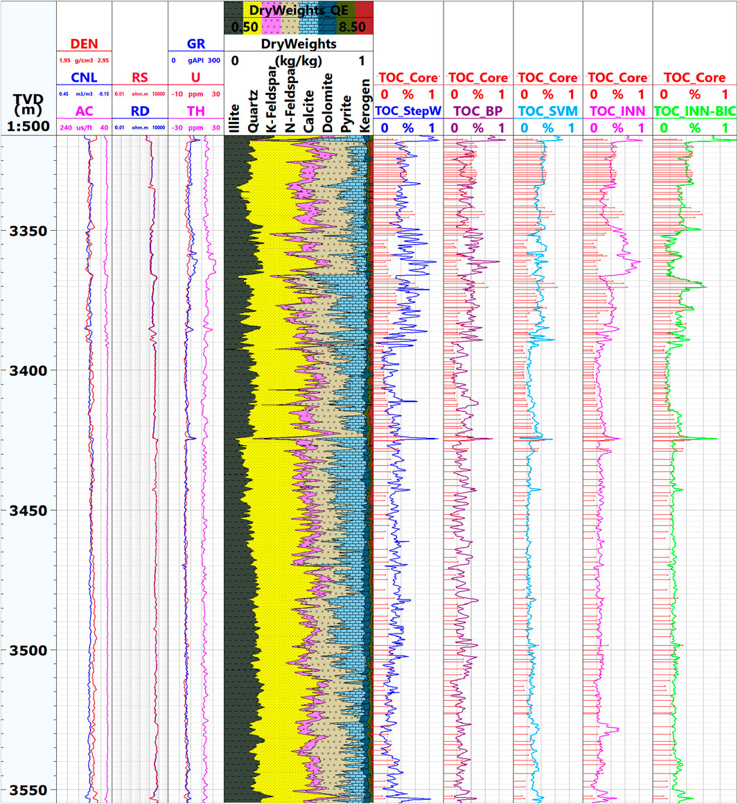 Figure 8. Comparison of TOC calculation models of JS103 well in the research block. The figure above shows, from left to right, the following columns:1–4: Depth (m); Density (DEN: g/cm3)/Neutron Porosity (CNL: %)/Acoustic Time Difference (AC: μs/ft.); Resistivity (RD/RS: ohm·m); Natural Gamma (GR: gAPI)/Uranium Content (U: ppm)/Potassium Content (K: ppm).5: Mineral Content (Illite/Quartz/Potassium Feldspar/Sodium Feldspar/Calcite/Dolomite/Pyrite/Kerogen: kg/kg).6: Core Measured TOC (TOC-Core: %)/Stepwise Regression Method Calculated TOC (TOC-StepW: %).7: Core Measured TOC (TOC-Core: %)/BP Neural Network Calculated TOC (TOC-BP: %).8: Core Measured TOC (TOC-Core: %)/Support Vector Machine Algorithm Calculated TOC (TOC-SVM: %).9: Core Measured TOC (TOC-Core: %)/Original INN Model Calculated TOC (TOC-INN: %).10: Core Measured TOC (TOC-Core: %)/INN-BIC Model Calculated TOC (TOC-INN-BIC: %).