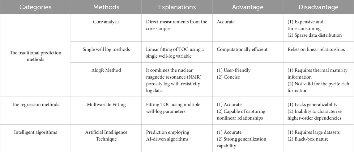 Currently, the prediction methods for shale reservoir TOC developed by scholars at home and abroad can be classified into three main research systems: traditional prediction methods based on empirical formulas, regression methods based on multivariate statistics, and intelligent algorithms based on neural networks (Table 1) (Aziz et al., 2020). Firstly, the traditional prediction methods based on empirical formulas primarily establish empirical relationships between conventional logging parameters and TOC using formation physical properties. The pioneering work began with the Schmoker method proposed by Schmoker (1979), which used regression analysis of density logs to estimate organic matter content and was subsequently refined (Schmoker, 1981; Schmoker and Hester, 1983). Subsequently, Passey et al. (1990) introduced the ΔLogR method utilizing resistivity and porosity logs, which has become a classic technique for TOC prediction due to its operational simplicity and strong applicability. In recent years, numerous scholars have optimized and improved the ΔLogR method for its application in various basins worldwide, primarily involving the use of variable slopes, baseline adjustments, and replacing the maturity parameter LOM with thermal indicators such as Tmax or Ro (Li et al., 2020; Wood, 2020; Zheng et al., 2021; Mulashani et al., 2021; Zhang et al., 2022). Secondly, the multiple linear regression methods employ trial-and-error to select logging parameters significantly correlated with TOC and simulate the mathematical relationship between multiple logging parameters and TOC through linear regression. By considering the influence of more factors, their prediction accuracy is significantly improved compared to empirical formula methods (Zhang F et al., 2023; Hui et al., 2023; Feng et al., 2023; Zhang H et al., 2023; Zhang et al., 2025). For instance, Zhang et al. (2025) demonstrated that a multiple linear regression prediction model could effectively predict TOC content in marine-continental transitional shales, achieving accuracy comparable to the BP model, through comparative studies with other models. The third category includes artificial intelligence methods, such as neural network algorithms, which build complex nonlinear models that better capture the underlying relationships in the data and improve prediction accuracy. These methods have demonstrated superior performance, especially in handling large-scale and high-dimensional data, effectively enhancing prediction precision (Nyakilla et al., 2022; Gordon et al., 2022; Liu et al., 2023; Lai et al., 2024; Ehsan et al., 2025a). For example, Lai et al. (2024) used principal component analysis to preprocess well log and TOC data, establishing a TOC prediction model based on BP Artificial Neural Network (BPANN) and Gradient Boosting Decision Trees (XGBoost). Their research showed that the XGBoost model offers higher calculation accuracy.