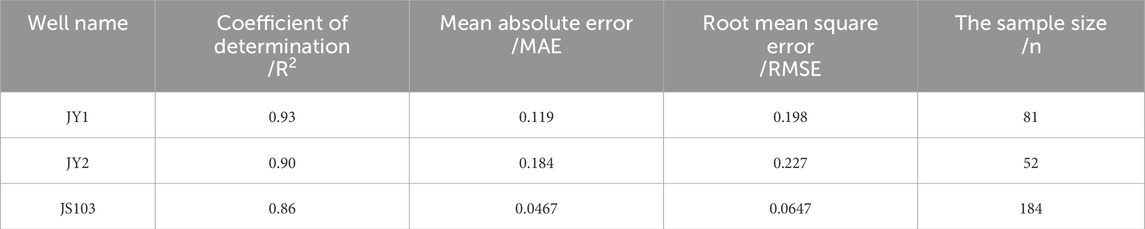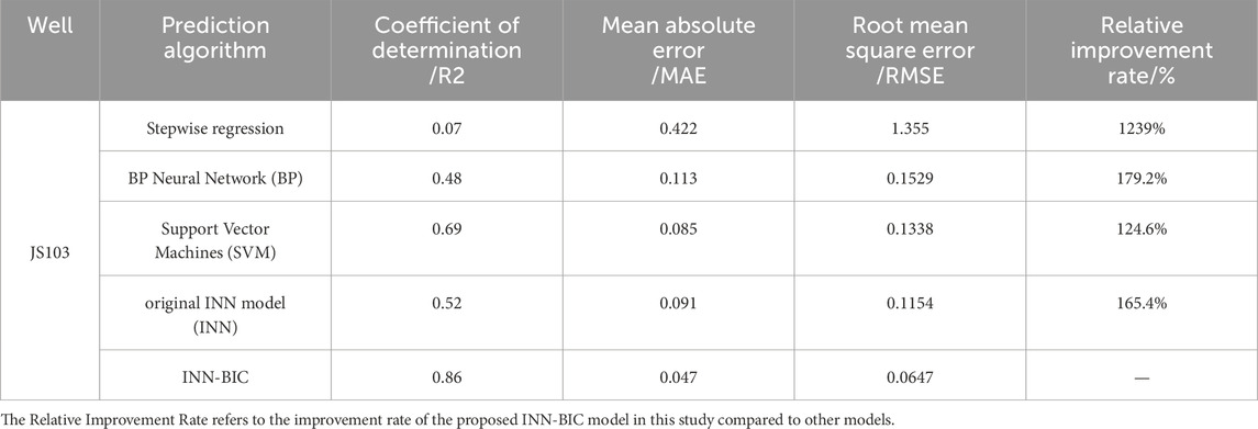 To further verify the superiority of the INN-BIC model, a multi-method comparison analysis was conducted on Well JS103 (Table 4). In this analysis, the original INN neural network used both quadratic and cubic polynomial terms for fitting, and the model achieved its best performance with the following expression (Equation 7):