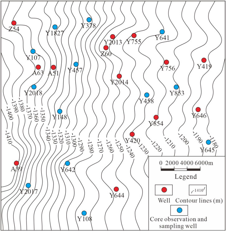 Figure 2. Structural map of the top surface of the He-8 Member in the study area and plan map of sampling and core observation well locations.