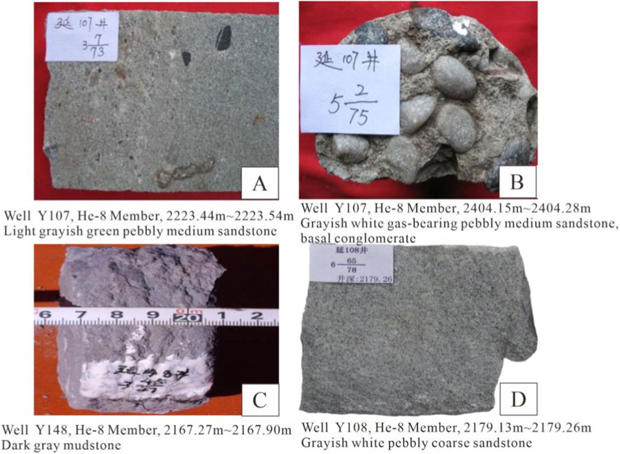 Figure 3. Typical lithological characteristics of the He-8 Member in the study area. (A) Well Y07, 2223.44m∼223.54m; (B) Well Y107, 2404.15m∼404.28m; (C) Well Y148, 2167.27m∼2167.90m; (D) Well Y108, 2179.13m∼2179.26m.