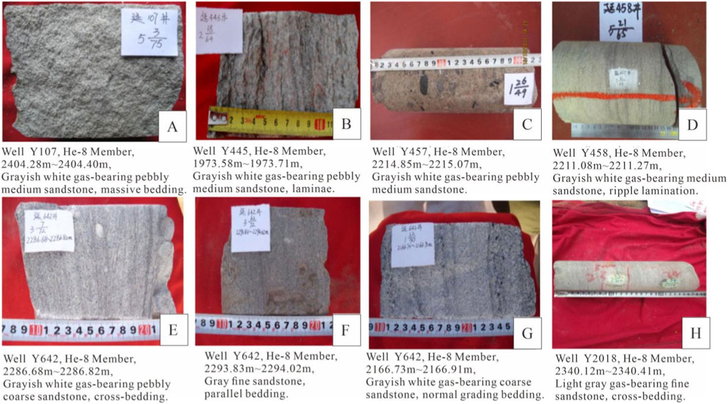 Figure 4. Typical sedimentary structural characteristics of the He-8 Member strata in the study area. (A) Well Y107, 2404.28m∼2404.40m; (B) Well Y445, 1973.58m∼1973.71m; (C) Well Y457, 2214.85m∼2215.07m; (D) Well Y458, 2211.08m∼2211.27m; (E) Well Y642m, 2286.68m∼2286.82m; (F) Well Y642, 2293.83m∼2294.02m; (G) Well Y642, 2166.73m∼2166.91m; (H) Well Y2018, 2340.12m∼2340.41m.