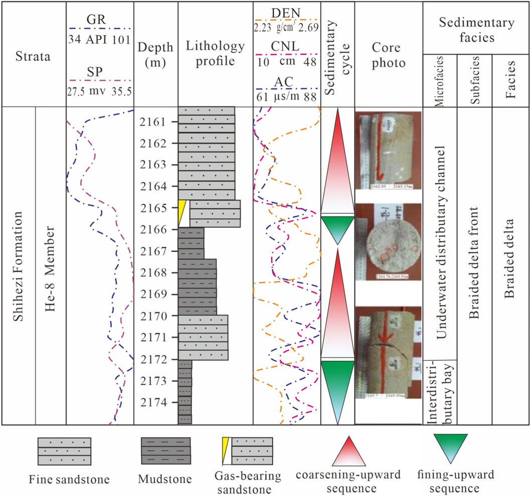 During the early Middle Permian, the tectonic framework of the basin was characterized by uplift in the north and tilting in the south, while the paleoclimate shifted to arid and semi-arid conditions (Li et al., 2024; Guo et al., 2025). As a result, fluvial systems transitioned from meandering rivers during the Shanxi Formation deposition to braided rivers. Due to the increasingly arid climate, coal formation ceased in the Late Paleozoic (Mi et al., 2022; Guo et al., 2025; Wang et al., 2025). Influenced by these paleotectonic and paleoclimatic conditions, the He-8 Member of the basin deposited a thick suite of relatively coarse-grained lithic sedimentary rocks. This was mainly manifested by significantly increased sediment supply from northern provenances, expansion of delta scale compared to the Shanxi Formation, and extensive development of sand bodies. The study area is located within the braided river delta front subfacies, where underwater distributary channels and interdistributary bays are interwoven. The intervals dominated by underwater distributary channels represent the most favorable facies zones for reservoir development (Figure 7).