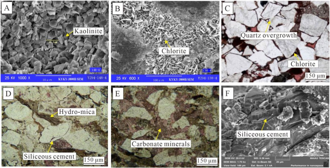 Figure 10. Microscopic thin-section and SEM characteristics of interstitial materials in lithic sandstone of the He-8 Member in the study area (A) Well Y294, 2432.26 m–2441.50 m, kaolinite cement; (B) Well Y294, 2432.26 m–2441.50 m, chlorite cement; (C) Well Y275, 2286.35 m, tightly compacted grains with chlorite clay coats; (D) Well Y2065, 2246.34 m–2246.46 m, minor late-stage calcite filling intragranular dissolution pores and quartz overgrowths visible; (E) Well Y2065, 2242.95 m–2242.19 m, early calcite forming poikilitic cement; (F) Well Y457, 2208.5 m, quartz-grain secondary overgrowth.