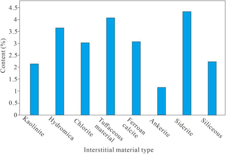 The main interstitial materials in the reservoir intervals of the He-8 Member are clay minerals (kaolinite, chlorite, hydromica) (Figures 10A–D), silica cement (Figure 10D), and carbonate cements (Figure 10E). Among these, kaolinite and hydromica are relatively abundant, followed by chlorite and tuffaceous material, while siliceous cement and ferrocalcite are less common. The average content of clay mineral cement is 3.1%. Hydromica content ranges from 0% to 7%, with an average of 3.67%; kaolinite content varies between 0% and 6%, averaging 2.15%; tuffaceous material content ranges from 0% to 12%, averaging 4.07%; and chlorite content spans from 0% to 13%, with an average of 3.04%.