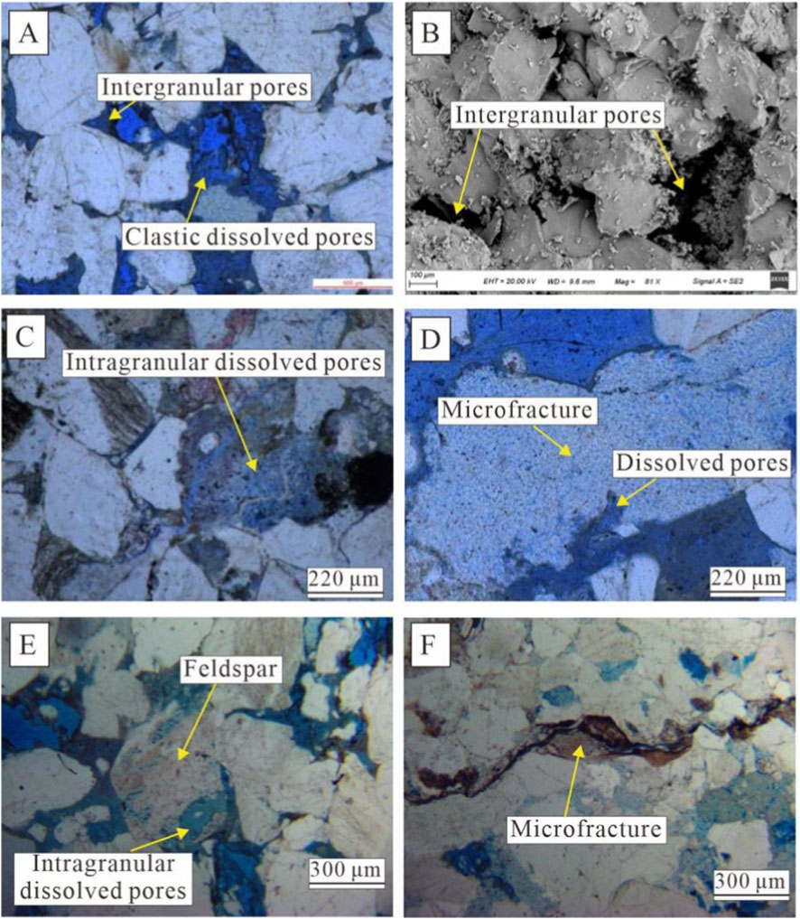 Figure 12. Microscopic characteristics of pore types in the He-8 Member reservoir, study area (A) Well Y120, 2560.72–2560.81 m, pebbly coarse-grained lithic sandstone: residual intergranular pores and dissolved pores within volcanic lithics; (B) Well Y378, 2735.72–2735.84 m: quartz overgrowths and residual intergranular pores; (C) Well Y121, 2627.39–2627.48 m, coarse-to medium-grained lithic sandstone: micro-fractures and intragranular dissolution pores in volcanic rock fragments; (D) Well Y120, 2560.72–2560.81 m, pebbly tuffaceous coarse-grained lithic sandstone: intercrystalline pores within kaolinite; (E) Well Y120, 2561.32–2561.42 m: intragranular dissolution pores in feldspar and residual intergranular pores; (F) Well Y121, 2620.73–2620.81 m: micro-fractures and intragranular dissolution pores in volcanic lithics.