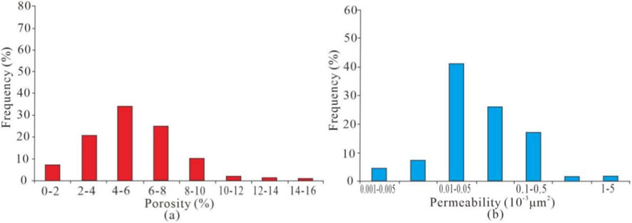 The confining-pressure permeability of the sandstone reservoirs ranges from 0.001 × 10-3μm2 to 5.577 × 10-3μm2, with a mean of 0.053 × 10-3μm2 and a median of 0.044 × 10-3μm2. The permeability distribution is as follows: 0.001–0.005 × 10-3μm2 accounts for about 4.5%, 0.005–0.01 × 10-3μm2 for 7.5%, 0.01–0.05 × 10-3μm2 for 41.2%, 0.05–0.1 × 10-3μm2 for 26.0%, 0.1–0.5 × 10-3μm2 for 17.2%, 0.5–1.0 × 10-3μm2 for 1.8%, and greater than 1.0 × 10-3μm2 for 1.8% (Figure 14b).