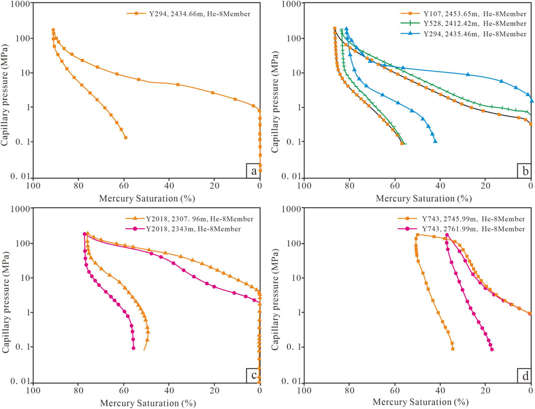 Figure 15. Typical high-pressure mercury-injection curves of sandstone samples from the He-8 Member, study area. Notes: (a) Type I reservoir; (b) Type II reservoir; (c) Type III reservoir; (d) Type IV reservoir.