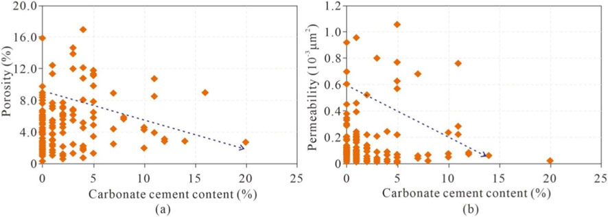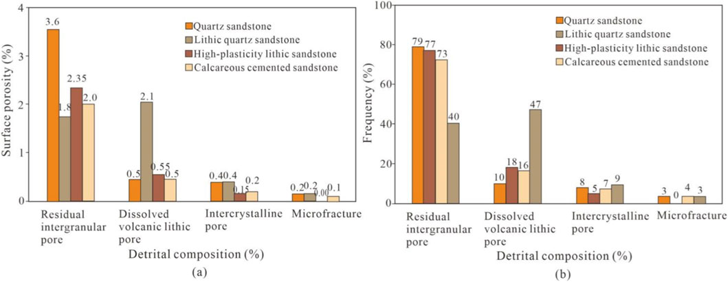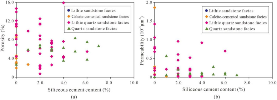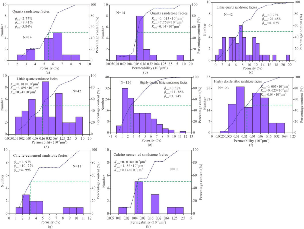 Statistical results of petrophysical properties indicate that the lithic quartz sandstone facies reservoir exhibits the best petrophysical properties, followed by the quartz sandstone facies reservoir, then the lithic sandstone facies reservoir, while the calcareous cemented facies reservoir shows the poorest petrophysical properties (Figure 17).