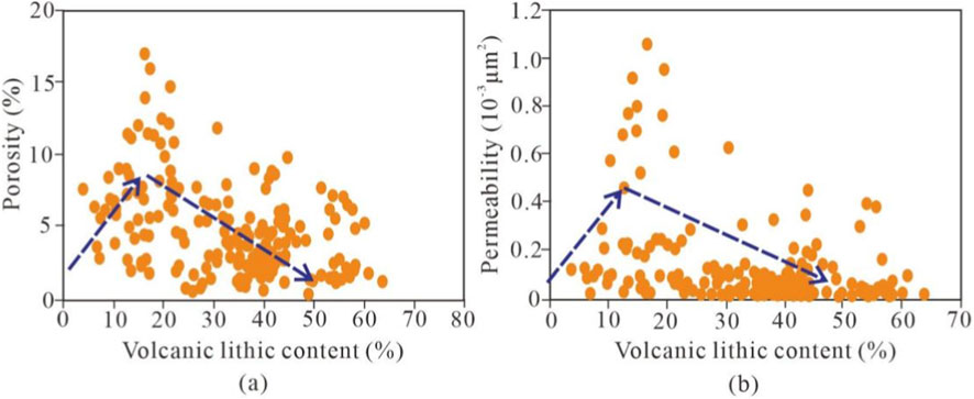 2. Pore types include residual intergranular pores, dissolution pores (feldspar and lithic), intercrystalline pores and micro-fractures; among these, intragranular dissolution pores within volcanic lithics are the most abundant. Net-confined porosity ranges from 0.5% to 15.0% (mean 6.7%), and net-confined permeability from 0.001 × 10-3μm2 to 5.577 × 10-3μm2 (mean 0.053 × 10-3μm2), classifying the interval as an ultra-low-porosity, tight reservoir.
