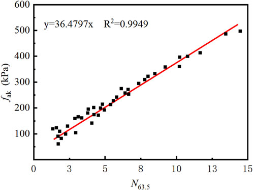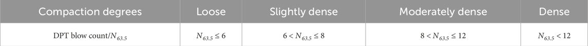Static load tests and heavy cone dynamic penetration tests were conducted at 47 selected test sites. As illustrated in Figure 1, the DPT blow count (N63.5) for coral soil exhibited a strong linear relationship with the characteristic value of foundation load-bearing capacity (fak): fak = kN63.5, where the k-value for coral debris is approximately 36.5. Additionally, the compaction degrees of coral sand were categorized based on dynamic penetration test results, as summarized in Table 1.