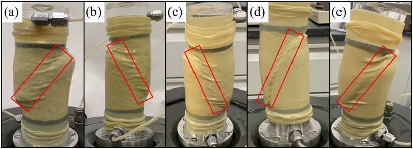 Figure 2. Shear failure modes of coral sand. (a) Gravel sand. (b) Coarse sand. (c) Medium sand. (d) Fine sand. (e) Silty sand.