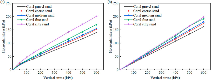 Figure 3. Vertical stress-horizontal stress relationship curves for coral sand. (a) Dry state. (b) Saturated state.