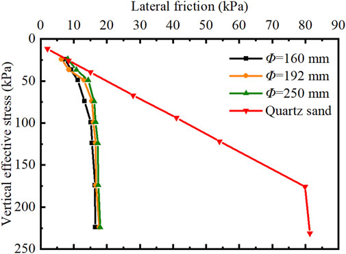 The variation in side friction resistance of piles embedded in quartz sand under different effective vertical stress conditions was calculated based on the model test results for driven piles using the recommended methods from the American Petroleum Institute (API) standards (Institute, 2000). These results were then compared with those obtained from coral medium sand, as depicted in Figure 6. Both types of strata exhibited a parabolic distribution of pipe side friction resistance. Coral sand exhibited a lower pile side friction resistance of approximately 17.5 kPa, which is 21.4% of the pile side friction resistance in quartz sand. This is close to the 27% observed in Jiang’s experimental results (King and Lodge, 1988). The stress conversion showed that the ultimate side friction resistance for coral sand corresponded to an embedding depth of approximately 9.3 m, while for quartz sand, it was about 25 m. This difference was primarily attributed to higher internal friction angle and cohesion in coral sand, which led to an arching effect during deformation and consequently resulted in smaller increments in lateral pressure.