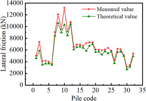 The study selected 32 protective tubes of the China-Maldives Friendship Bridge as the research subjects and conducted in situ high-strain testing on the pile foundations, as depicted in Figure 7. The proposed calculation method for side friction resistance in coral reef strata was applied to evaluate the side load-bearing capacity of driven piles in the China-Maldives Friendship Bridge. The computation results were compared with the field test results, as illustrated in Figure 8. The average error between the two was 10.3%. Additionally, the theoretical values were consistently lower than the measured values. This indicates that the calculation method proposed in this study is conservative and validates the rationality of the modified calculation approach.