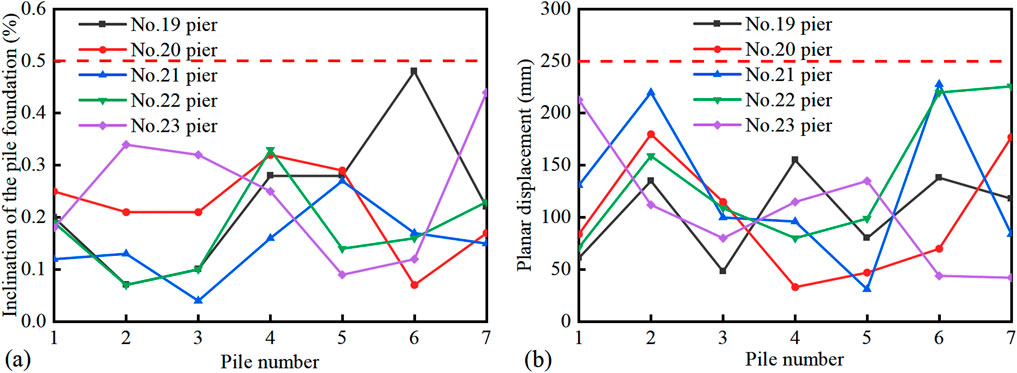 Figure 13. Precision of pile installation. (a) Inclination of the pile foundation. (b) Planar displacement of the pile foundation.