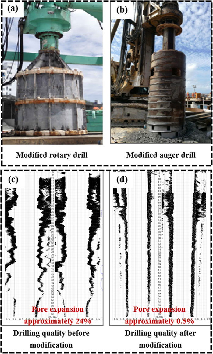 Figure 14. The modified drilling equipment and a comparison of its effects. (a) Modified rotary drill. (b) Modified auger drill. (c) Drilling quality before modification. (d) Drilling quality after modification.