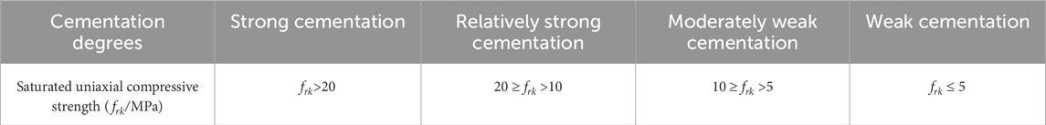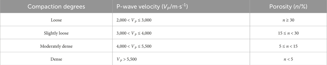 The compressive strength of reef limestone is primarily influenced by coral species, rock structure, and the degree and type of cementation, where the cementation degree is the most significant factor. Therefore, the degree of cementation is employed as the classification standard for assessing the engineering properties of reef limestone. Table 2 categorizes reef limestone into five types: strong cementation, relatively strong cementation, moderate cementation, weak cementation, and very weak cementation. The compaction degree of the rock is related to porosity, which in turn is correlated with the velocity of P-waves. Table 3 provides classifications of reef limestone compaction degree based on P-wave velocity or porosity. In cases where evaluations based on P-wave velocity and porosity are inconsistent, the results based on P-wave velocity take precedence.