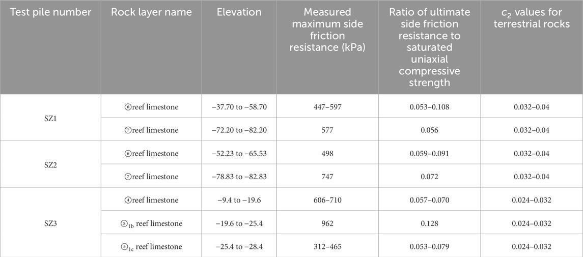 3. Seven simplified casting interface shear characteristics at the reef limestone-pile interface were analyzed. The recommended range for the c2 of cast-in-place piles embedded in reef limestone strata is between 0.05 and 0.11, which is 2–3 times that observed in terrestrial limestone.