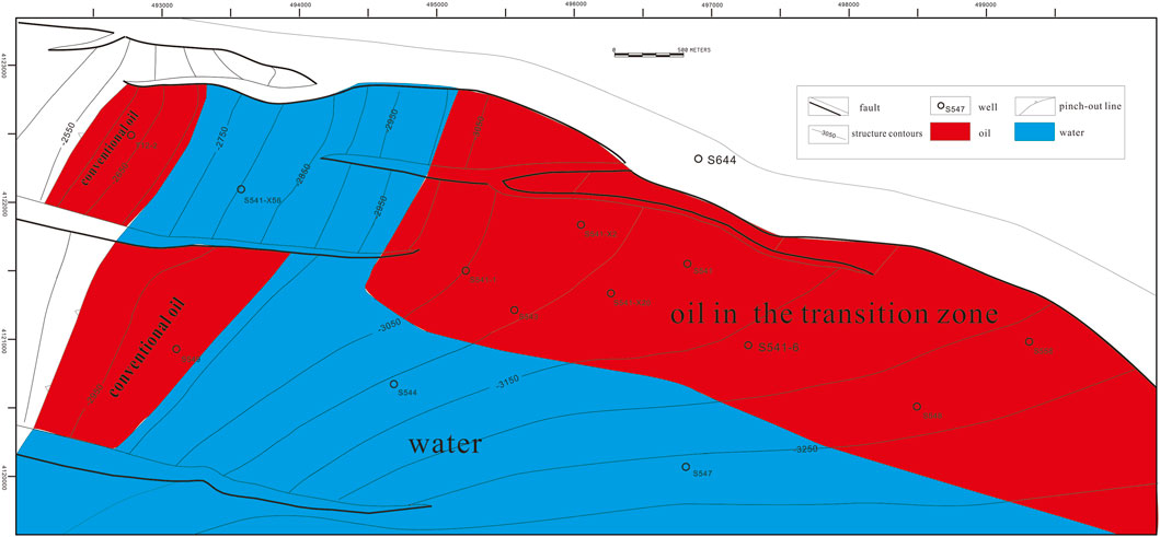 The influence of faulting is also evident in the north-south direction (Figure 5b). Oil-bearing layers in the transitional zone are generally confined to a zone within 1000 m of a major fault. Although the existing data are still insufficient to establish a quantitative relationship between distance from the fault and oil saturation, drilling results show that, under conditions of stable sandstone development, well Shang 541 is 250 m from the fault with oil layers’ thickness of 67 m, well Shang 543 is 800 m from the fault with oil layers’ thickness of 28 m, and well Shang 544 is 1,400 m from the fault with pure water layers. It is evident that the farther away from the fault, the less developed the oil-bearing layers become. In the north–south direction, structural highs and lows have no obvious controlling effect on oil-bearing properties. Well S544, for example, is at a similar structural elevation to the oil-bearing S541 well but is located far from the fault and is entirely water-bearing.