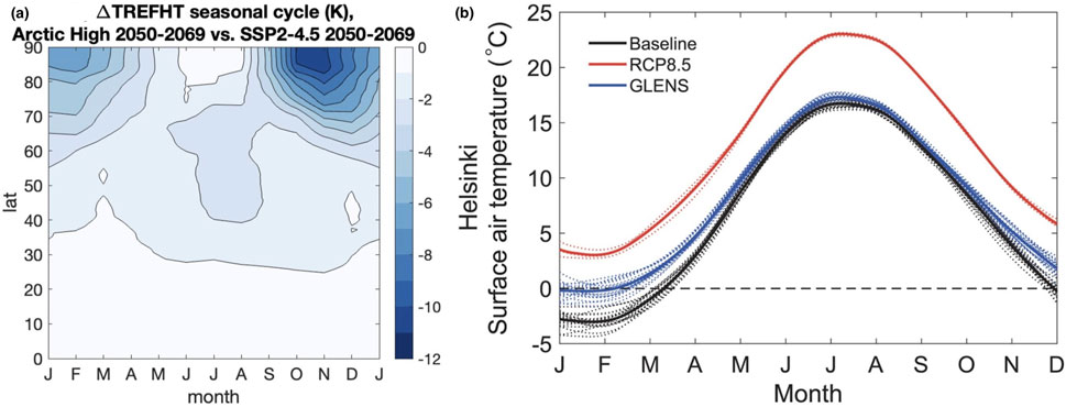 Figure 1. (a) Change in surface temperature in CESM2 between a middle-of-the-road greenhouse gas emission scenario (SSP2-4.5) and a stratospheric aerosol injection scenario where aerosols are injected at 60° North in the months of March, April, and May. The figure shows amplified cooling in the Arctic in winter, and is reproduced from a paper cited by Siegert et al. (2025) (Lee et al., 2023). (b) Seasonal cycle of temperature in Helsinki for the baseline climate (RCP8.5 in 2010–30), a high emissions scenario (RCP8.5 in 2075–95), and a scenario with injection of SO2 at 15° and 30° North and South (GLENS). The figure shows that even injection at low latitudes can significantly cool polar regions including in winter (difference between red and blue lines), and is reproduced from a paper cited by Siegert et al. (2025) (Jiang et al., 2019).