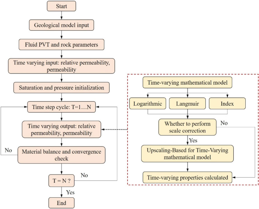 The upscaling methodology was integrated into an in-house, fully implicit, three-phase black-oil reservoir simulator to enable the dynamic evolution of reservoir properties. The implementation architecture, depicted in Figure 2, embeds a time-varying property module directly into the simulator’s main computational loop, allowing for the consistent update of fluid flow parameters at each time step.