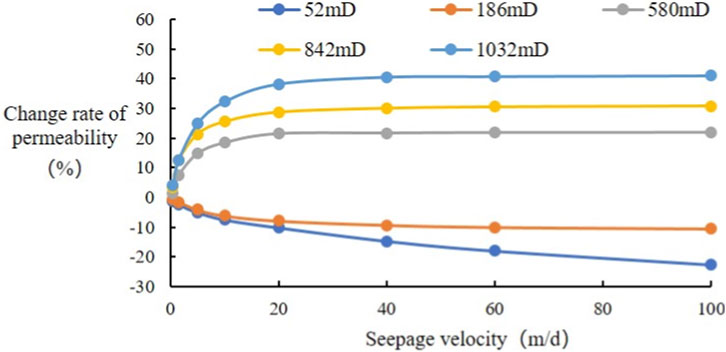 Figure 3. The relationship between permeability and flow velocity obtained from different core tests.